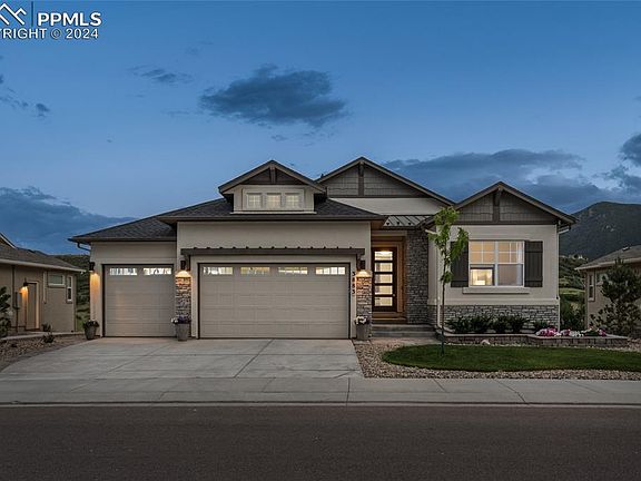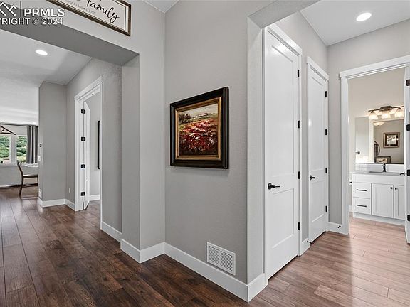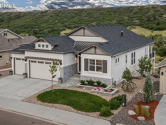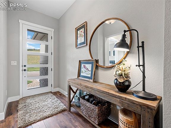 Welcome to this exquisite 5-bedroom, 4-bathroom ranch-style home nestled in the picturesque West Valley of Forest Lakes. Boasting panoramic mountain views, this residence offers a serene escape. Upon entering, you are greeted by a spacious great room & gourmet kitchen adorned with floor-to-ceiling windows that frame the majestic views. The kitchen features a chef's dream island, soft-close cabinets, luxury appliances, & is designed for both culinary creations & casual gatherings. Throughout the home, gleaming wide plank wood floors, 10ft ceilings, 8ft doors, electrical prepared for hot tub installation, all enhance the ambiance of the home. The primary suite is a sanctuary unto itself, featuring a spa-like bathroom & a generously sized walk-in closet conveniently connected to the main floor laundry room, which offers ample storage & a practical folding area. Adjacent to the primary suite is a private guest wing, complete with a spacious bedroom & a full bathroom. The full finished garden level walk-out basement is an entertainer's paradise, featuring an in-law suite with an ensuite bathroom & large walk-in closet. A second expansive great room with a fireplace provides additional space for relaxation & hosting guests, with rough-ins ready for a wet bar installation. Step outside onto the sprawling grounds & experience the breathtaking 360-degree views of Rampart Range foothills & protected open space, in the front & back of the home, making this property one of the most desirable lots. Take note of the professionally crafted landscaping. Whether you're enjoying the sunset from the expansive deck or exploring the nearby trails, this home offers a true Colorado mountain living experience. Residents of Forest Lakes enjoy access to parks, miles of walking/hiking/bike paths, & private access to the 65-acre lake. Don't miss the opportunity to make this extraordinary mountain retreat your own.