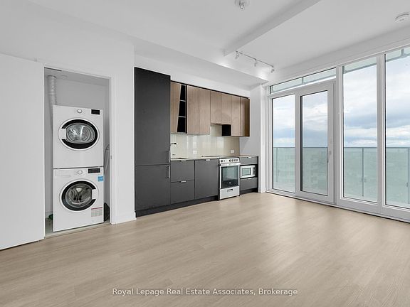 Welcome to M City 2 in the heart of Mississauga's vibrant downtown core. This stunning 2-bedroom, 1-bathroom suite offers a bright and efficient layout with floor-to-ceiling windows and a walk-out to a private balcony boasting unobstructed city and lake views. The modern kitchen features built-in stainless steel appliances, sleek cabinetry, and quartz countertops, seamlessly connecting to the open-concept living area - perfect for everyday living or entertaining. The primary and secondary bedrooms are both generously sized with large windows allowing for ample natural light. The suite also includes in-suite laundry, contemporary finishes throughout, and laminate flooring for a cohesive modern feel. For added convenience, this home includes 1 parking space and 1 locker. Residents of M City 2 enjoy access to premium amenities including a rooftop pool with cabanas, fitness centre, yoga studio, outdoor BBQ area, party lounge, and 24-hour concierge service. Conveniently located steps from Square One Shopping Centre, Sheridan College, dining, and transit.