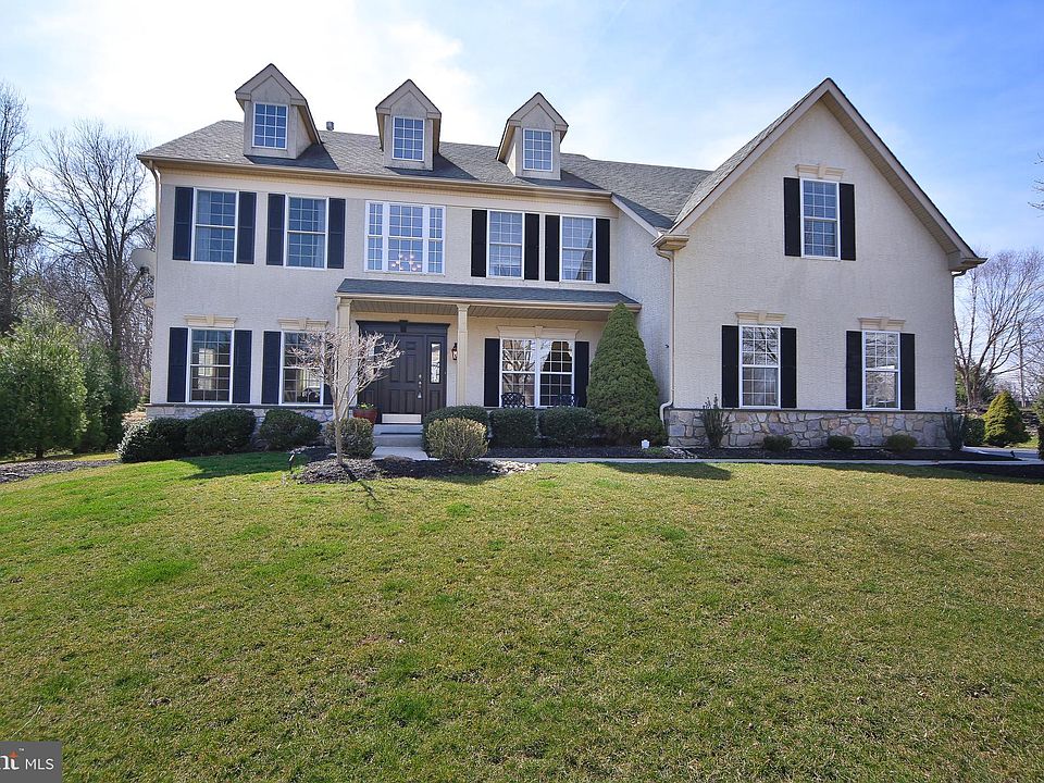 Located in Award winning Central Bucks East School District and centrally located just a few minutes outside of the heart of Doylestown, lies this Classic Colonial in The Ridings of Buckingham. Upon arrival notice the front porch, big enough to sit and relax in the evenings to mingle with the friendly neighbors. The two story foyer greets you with the front staircase, flanked by the first floor office, currently being used as a second den and the living room. From front to back, the living room blends with the large formal dining room with paneled trim and large windows letting the sun come from east to west in the evenings. Awesome space for those large gatherings as a long table can be expanded to accommodate a grouping of many. As you enter into the kitchen you have an immediate sense of space and tranquility. The white cabinets with granite counter tops, gas range, and stainless appliances make cooking and entertaining enjoyable while the slider to the beautiful backyard lends itself to a delightful space to grill and share with family and company. You may have as big a table as you'd like in the space allowed as the floor space is generous. The expanse of the connected family room is sure to delight as this is the ideal layout for those wanting an open concept. The gas fireplace makes a cozy impact in the soaring ceilings of this room. The wall of windows lets in the bright morning sun, and in the afternoon, the warmer glow. To set this home apart from others, is the back staircase that pronounces the greatness of this room upon ascending to the upper level. The first bedroom encountered from the backstair case is the master. The large vaulted ceilings in the master create a grand notion that is carried on through the sitting/office area with vaulted ceilings as well. There are three large walk in closets here as well prior to entering the master bath, complete with soaking tub shower stall and double vanity. The other 3 remaining bedrooms on this level are sized generously, and have great closet space and large sets of windows allowing for plenty of natural light. There is a nicely appointed shared hall bath on this level with a double vanity as well. To add increased value and space, lets retreat to the lower level through the paneled glass door. There is space allotted for bare, yoga or dance as the flooring and mirror are set up and ready for practice. Plus this area has a large additional entertainment room and an additional exercise equipment area. A large storage room and storing closets help keep you nicely organized. The Gas Heater and Water Heater are housed in this area as well. New AC unit!This home sits on one of the largest lots in the neighborhood. Its property lines are shared with the one of the original farm houses so the views are nice and long. From the maintenance free composite decking, sit and enjoy the long afternoons and the western setting sun. The yard has nice flat space for playing and also a little hill at it edges which enhances the topography as well as the playtime. Seller had exterior stucco tested and it was solid! This fantastic neighborhood is tucked back off the main roads providing a nice blend of privacy and the comfort of easy access to everything.... Doylestown, New Hope, PA Turnpike, Rts 202 & 611. Do not miss out on this rare opportunity!