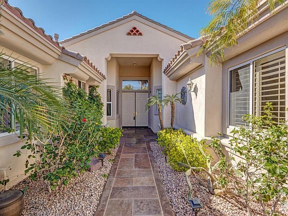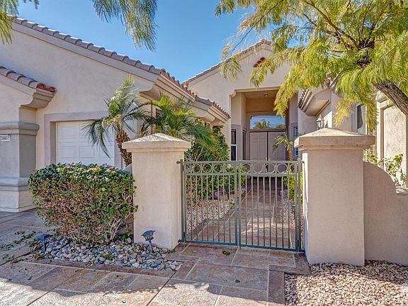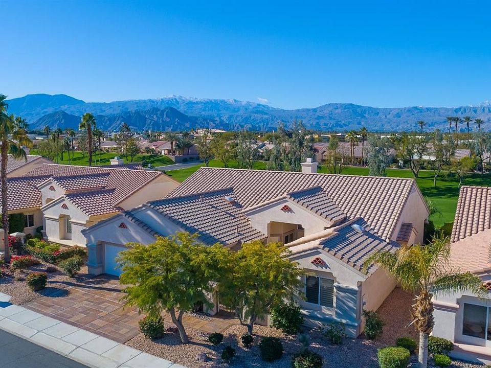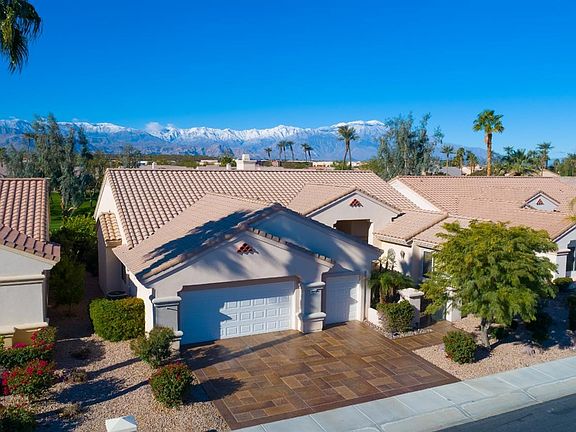 55+ Sun City Palm Desert. Most popular PORTOFINO Estate model with 3 full bedrooms and en-suite bathrooms PLUS a powder bath! Elevated over the Santa Rosa golf course with stunning South and West panoramic mountain views. Nice curb appeal. gated entry. Inside, 10 ft. and 12 ft. ceilings, New windows in 2013, New HVAC (Trane) in 2015, Newer carpet, paint, upgraded tile. Kitchen features classic mitered corner window with view, skylight, upgraded cabinets, new appliances in 2013, chefs island, breakfast bar. Two-sided cozy fireplace between the living room and family room, custom built-ins. Master suite has door out to patio, shutters, crown molding, master bath has dual vanity with soaking tub, shower with glass block accents, Two walk in closets. RETREAT room/exercise room/office. Laundry room has utility sink and plenty of cabinets. 2 car garage plus golf cart garage has epoxy floors. Interior photos soon.