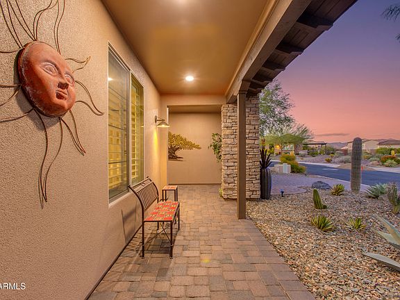 Inside, you'll find tile flooring throughout, custom glass office dividers with integrated lighting, French doors into the den, crown molding, a fireplace insert, dry bar, surround sound (inside & out), and motorized sunshades. Additional touches include epoxy-sealed garage floors, paver sealant refresh, and a custom front door glass insert with a COOL retractable screen. This home exudes comfort, quality, and style - a rare turnkey retreat ready to enjoy in Wickenburg Ranch!