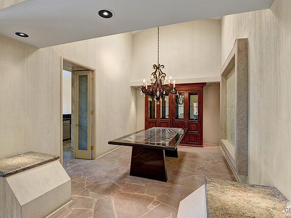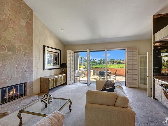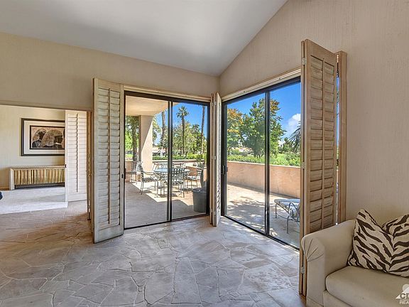 Ideal house for entertaining with an enlarged slate private walled patio with views. Three bedrooms, three bath, powder room add to the comfort this home has to offer. Master Suite has private patio for morning coffee, large walk-in closet, dual vanities,and jacuzzi tub. Foyer opens to living room with slate fireplace and wet bar. Formal dining room with skylights is great for entertaining family and friends.Make Palm Valley Country Club with all its amenities your new address in the desert. Make an offer!