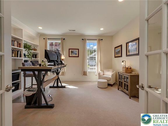 Resort style living in Traditions at Green Pond, a highly desirable 55+ community in Bethlehem Twp. Two-story Jefferson design offers over 2,200 sq ft with upgrades throughout. Abundant natural light accentuates the bright open floor plan, perfect for entertaining. The welcoming kitchen features upgraded cabinets, upgraded appliances, upgraded Quartz stone countertops, large island with seating, and a pantry closet. The kitchen adjoins a spacious dining area and living room with a gas fireplace, beautiful ceiling beams, and a view to a large covered back porch. Enjoy morning coffee on the patio and cool evenings relaxing with friends. The first floor owner’s suite features a cathedral ceiling, en-suite bath, two walk-in closets, and convenient access to the laundry room. Completing the first floor is a large office/3 rd bedroom with custom built-in cabinetry, and a guest powder room. A beautiful, stained oak staircase takes you to a large second floor loft, a great place for younger visitors to hangout. The second floor also features a large guest bedroom, full bath, and a large storage/mechanical room. Additional highlights include a two-car garage, on-demand tankless gas hot water heater, and energy efficient building package. The community is just minutes away from Green Pond Golf Club, St. Luke’s University Hospital Anderson campus, a variety of restaurants, grocery, retail stores, bike trails, and parks. Enjoy a maintenance-free active-lifestyle at its finest.