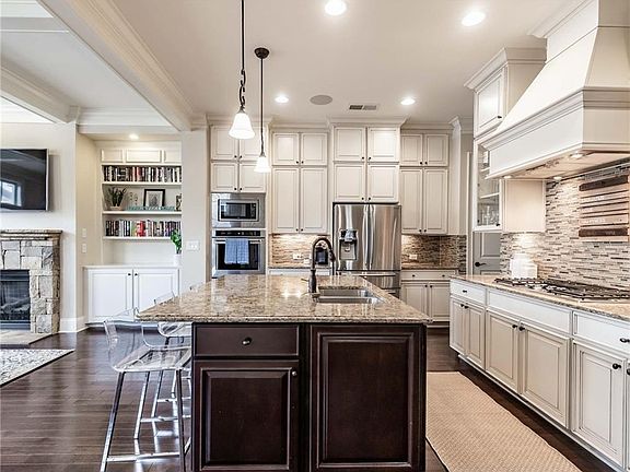 - Kitchen Features: Breakfast Bar, Pantry, View to Family Room, Stone Counters, Kitchen Island, Solid Surface Counters, Cabinets White