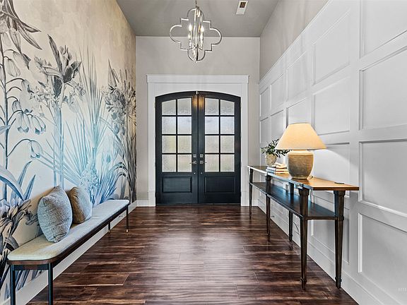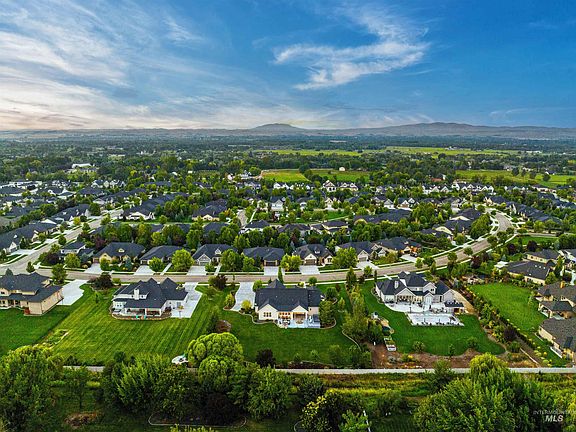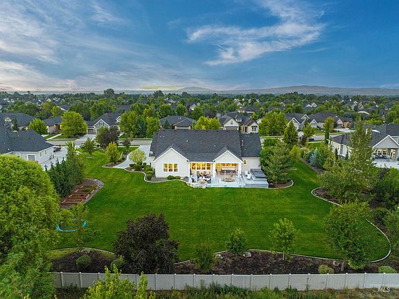 Extraordinary 1 acre estate situated in coveted Eagle w/ no direct rear neighbors! Multi-generational living w/ nearly 5500 sf, 6 spacious bedrooms, 4.5 bathrooms, main level flex room, main level master + junior suite. Absolutely stunning interior that is showcased by a grand entryway, floor to ceiling stone fireplace w/ custom built-ins & wood beams ceiling, picturesque windows & natural light that floods the main level. Gorgeous gourmet kitchen features quartz countertop island, floor to ceiling custom cabinetry, Thermador range, double oven & walk-in pantry. Main level owner's suite boasts tray ceilings, private patio access, dual vanities, soaker tub, tile walk-in shower & oversized walk-in closet that passes thru to laundry room. Escape downstairs to the massive bonus room w/ kitchenette, theatre room w/ projector, 3 bedrooms + 2 full bathrooms. Excellent indoor/outdoor entertaining space- mature trees, covered patio, gas fire pit & plenty of room to build a shop! Community pool, park and walking paths