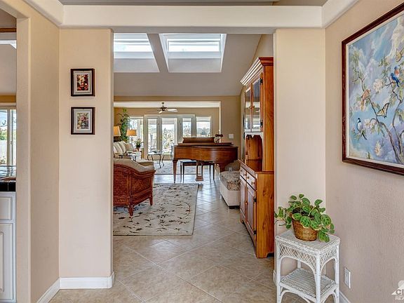 Welcome to this light, bright, and spacious home with open floor plan, high ceilings and skylights, that give a much larger feel than its 1764 square feet. Neutral colors provide a warm inviting feeling. The living room has ample windows and eastern views of the Chocolate Mountains. The master bedroom provides the same eastern view and features a large en-suite bathroom. The guest bedroom also has an adjacent bathroom, and there is a half-bath powder room for guests. The third bedroom provides a comfortable den/office. Spacious beautiful kitchen completes the interior package! This home has a two-car garage with interior entrance, a covered walkway entry, and attractive backyard with views. Palm Desert Greens is an active 55+ community with golf, tennis, clubhouse, community pools, shuffleboard and a billiards room. Property offered furnished except for piano.