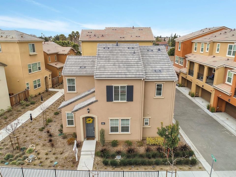 Beautiful 2 year Two story New Single family house built in the Prima community by DR Horton. This floor plan is The Savona which is 1618 sqft with 3 bedrooms, 2.5 baths and 2 car side by side garage. The open concept floorplan has 9 foot high ceilings throughout with plenty of natural light. Gourmet kitchen with dark espresso finished cabinets, satin nickel fixtures, large island, granite counter tops, beautiful backsplash and high end stainless steel appliances The master bedroom includes a spacious walk in closet. Upgrades include- Laminate flooring, Recessed lighting & ceiling fans, closet organizers, Central AC, Tankless water heater, Water softener and much more. Convenient upstairs Laundry. Low maintenance large side yard with paved concrete patio for entertaining. Close to shopping, theater, restaurants, parks and schools. Easy access to I-880, 92, Dumbarton Bridge and BART.