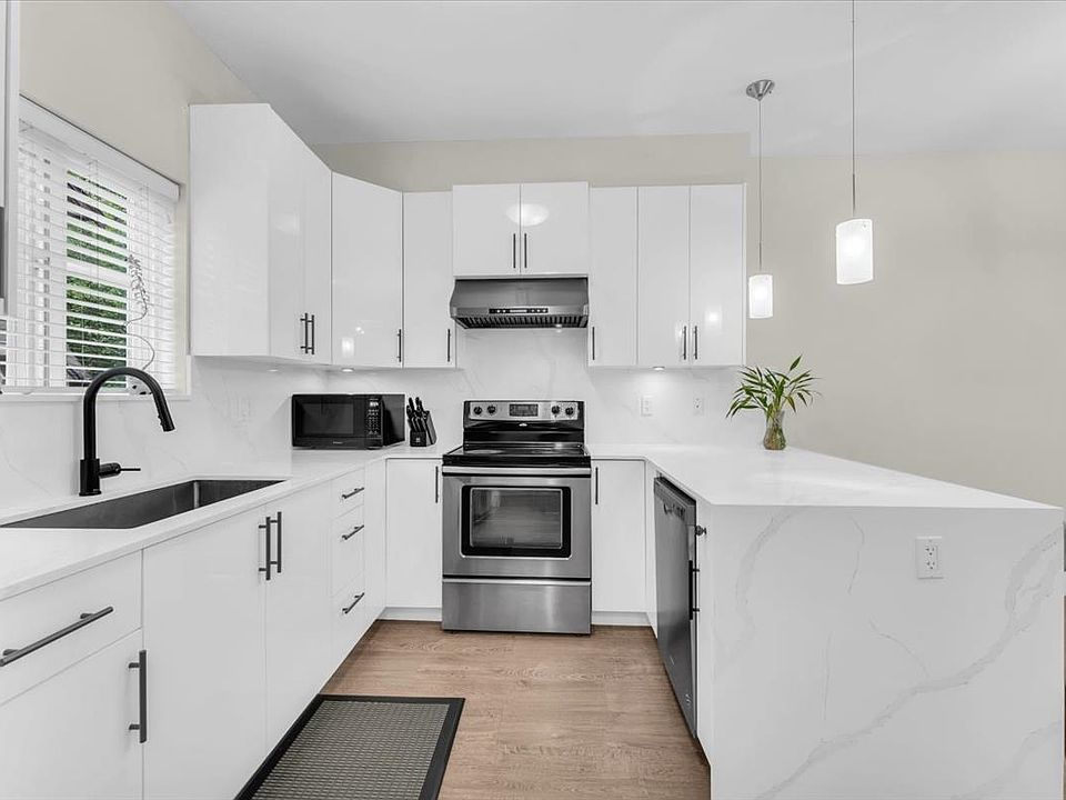 Discover exceptional value at Parkside Greene! A hidden gem nestled at the end of a cul-de-sac in Central Burnaby close to Boundary Rd and Canada Way. Tastefully renovated in 2021 with new laminate flooring throughout, kitchen countertops, resurfaced kitchen cabinets, and new shower doors. This home features soaring 9ft ceilings and an open layout that’s perfect for entertaining, with generously sized rooms that easily accommodate full-sized, house-worthy furniture—offering both comfort and style. Minutes to transit, Hwy, BCIT, Amazing Brentwood, Costco, Walmart, T&T Supermarket, shopping, restaurants and much more! School catchments: Cascade Heights Elementary, Moscrop Secondary. Comes with one parking and one storage locker. *Primary bed photo has been virtually decluttered and staged.