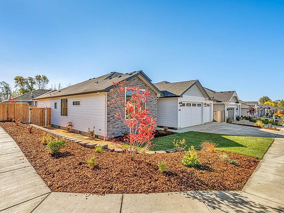 There's nothing like a new home & this one-level residence in East Medford's newest neighborhood is finished and ready to move in and enjoy. It features a popular open floor plan with a dramatic 2-story entry, 9-foot ceilings plus coffered ceilings in the great room and primary bedroom. The chef's island kitchen offers quartz countertops, contemporary natural wood & painted cabinets, walk-in pantry with a barn door & stainless steel appliances. Details include a warm gas fireplace, ceiling fans, TV/entertainment cabinet, custom light fixtures, rich vinyl planking floors throughout, designer 2-tone interior paint & stunning tile baths. The primary suite features dual vanities, a walk-in closet & a tile shower. Step out the French door onto the covered patio and fully fenced and landscaped garden. There's a 3-car garage. Live at the city's edge close to nature with surrounding mountain views, walking trails & the Larson Creek Center.