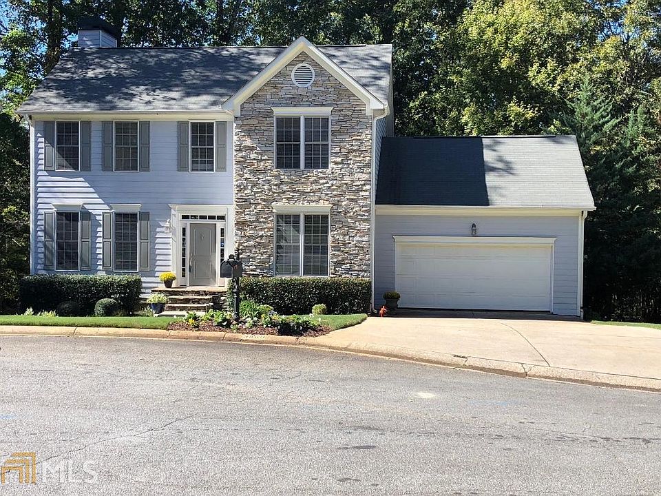 Wonderful Stacked stone/frame traditional on wooded cul-de-sac lot. New deck overlooks minimum care rear yard with stream. Eat in kitchen boasts lots of counter space, walk in pantry, granite counters and white cabinets, SS appliances. Great room has stacked stone fireplace; separate Living and Dining rooms; Master has double vanities and sep jetted tub and shower. Hardwoods and tile on first floor. Planned community has 4 pools, 11 tennis courts, 114 acre park with amphitheater, trails and parks, clubhouse and fitness center. Great Cobb schools. Over 100o square feet of space to add your media room/extra storage.