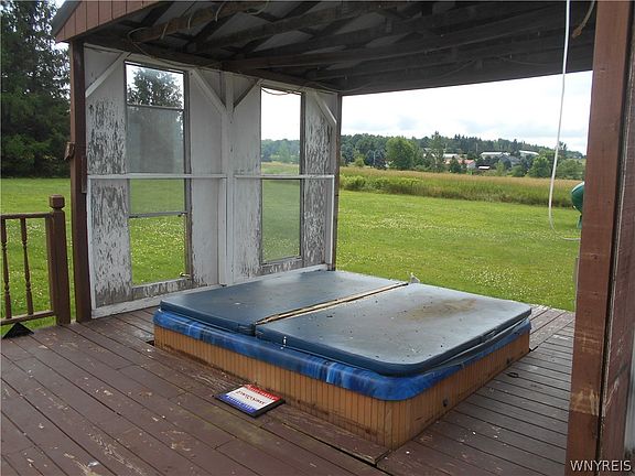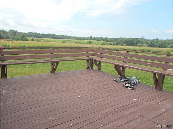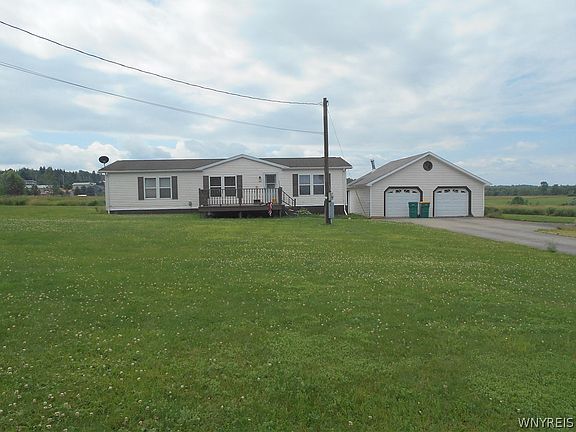 Great location! Great view. 1456 SQ Ft doublewide built in 1995. 3 bedrooms. 2 full bath home on 5.45Acres. Cement driveway leads to a 2.5 car garage with water, woodstove, and 2 overhead doors with operators. Rear deck is 26 x 19 includes hot tub and goggles and built in seating around the deck, which is accessed by sliding glass door from the kitchen. Front porch is 16x12. Home features kitchen with island, lots of cupboard space. Large laundry/utility room with washer and dryer. Dishwasher, stove and refrigerator included. 2 Bedrooms with full bath across the hall. Master Bedroom with bath includes features double sink, garden tub and shower. Central Air, Arcade Electric. Minutes to Route 98 and Arcade, yet still country living.