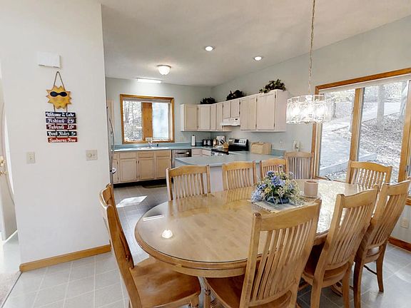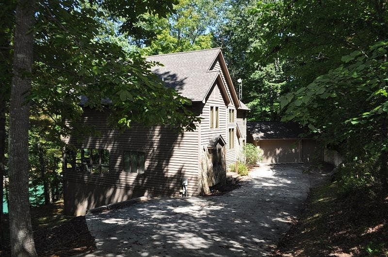 Great home on a great lot in protective cove with year around water. 5 bedrooms,, 4 & 1/2 bath. Kitchen, dining sitting room, master suite and 1/2 bath on entry level with large walk out deck. Upper level has 2nd master suite, 2 more bedrooms, bath and sitting area with sleeper sofa. Lower level has Family, media, rec room, 5th bedroom and bath and large utility area and walk out deck that is screened in and steps to lake and 2 bay covered dock with swim platform. This is on the rental program and a great rental investment or retirement home.