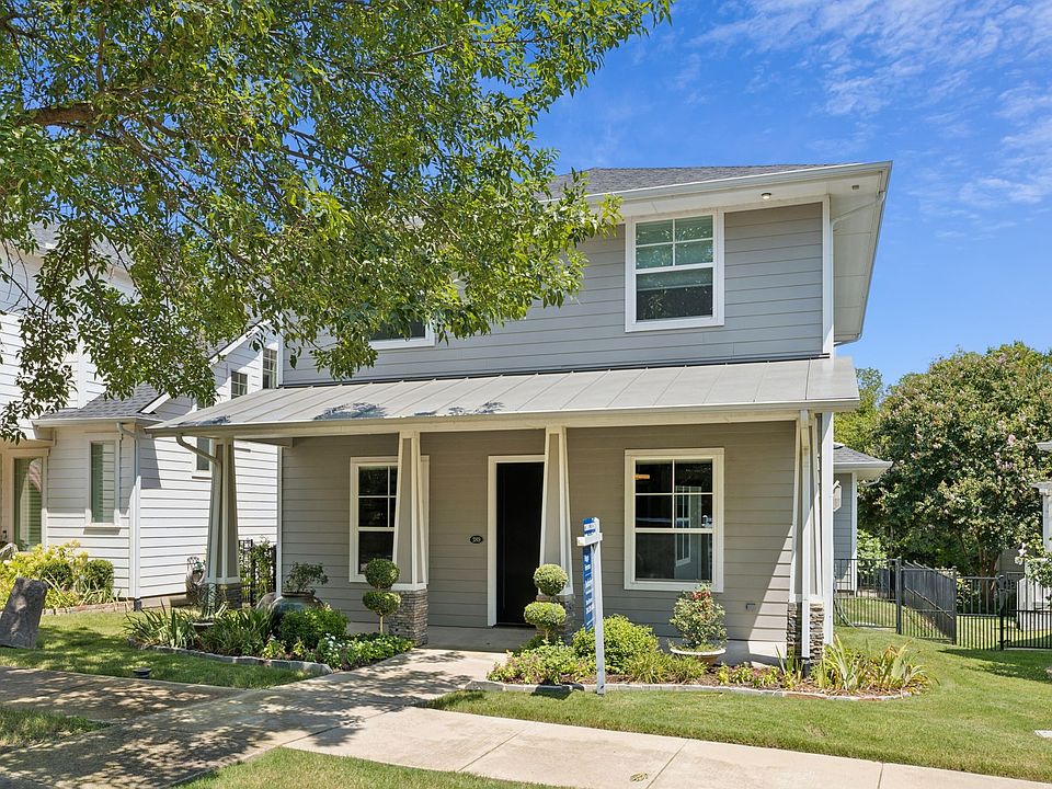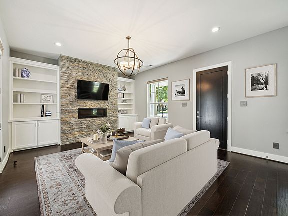 Cape Cod Craftsman in Park Place – This charming 3-bedroom, 2.5-bath home blends timeless curb appeal with modern style. A wide front porch welcomes you inside to an open, light-filled layout with rich dark hardwood floors, custom Lutron power shades on windows, and a stunning floor-to-ceiling modern stone fireplace as the living room centerpiece.