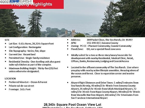 LOCATION! LOCATION! LOCATION! Welcome to 389 Packet Close! Fabulous 0.65 acre ocean view lot available to build your dream home. Highly desirable location at The Sea Ranch on California's Sonoma-Mendocino Coast. Redwood trees, rolling hills and coastal living with luxury amenities nearby. Highly desirable active lifestyle master planned community. Great opportunity.
