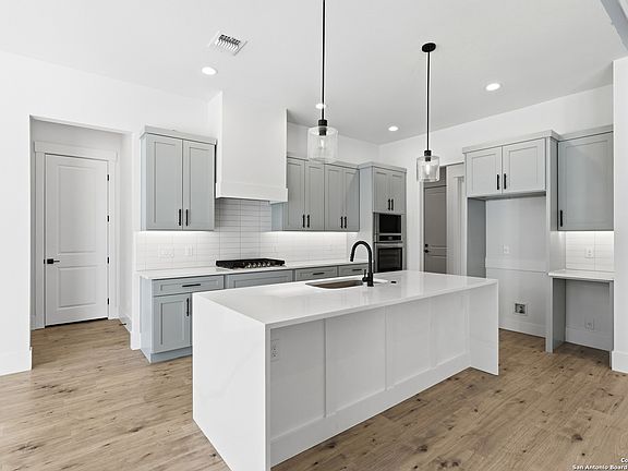 Located in the gated community of Cielo Rio Ranch in Pipe Creek, TX, this smart-built, custom Pillar Homes residence offers refined Hill Country living on 2 acres of usable land. The one-story layout features three bedrooms plus a dedicated office, ideal for flexible living and working from home. Designed with intention, the home includes Alexa-compatible smart lighting and automated blinds in the dining area, office, and bathroom, all easily controlled by voice or smartphone. The open-concept living space flows seamlessly into a modern kitchen anchored by a waterfall island and gas cooking-perfect for everyday living and entertaining. Beyond the interior, this home was custom-designed with future expansion in mind, featuring exterior electrical wiring, water plumbing, and gas connections, making it easy to add a gazebo or enhance the outdoor living space. A generator-ready outlet adds peace of mind during power outages. The primary suite offers a private retreat, while quality finishes and a water softener add comfort throughout. The home also benefits from a 10-year foundation warranty, along with existing plumbing and electrical warranties. Enjoy peaceful outdoor living with a covered patio, open land, and a private setting within a sought-after gated community-combining smart technology, thoughtful design, and Hill Country charm. Exclusions include playground equipment, BBQ, firepit, and security cameras.