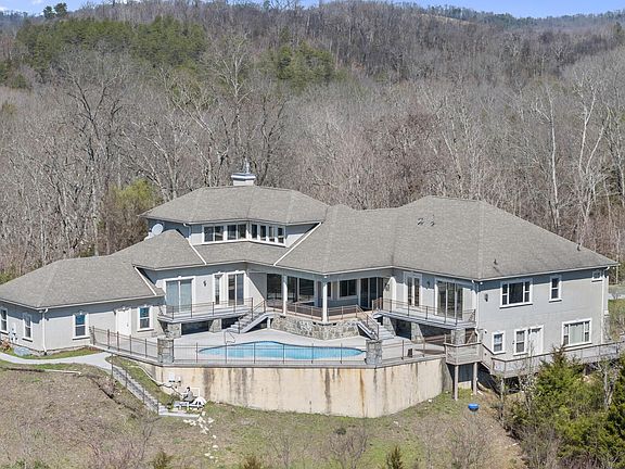 MOTIVATED SELLER! OUTDOOR GUNITE POOL COMPLETELY REDONE AND READY FOR SUMMER! LUXURY ESTATE HOME OR SHORT-TERM RENTAL/AIRBNB SITTING ON 5+ ACRES OF MOUNTAIN SERENITY WITH 4BR/5.5 BATH, FLEX ROOM, IN LAW QUARTERS, OUTDOOR POOL AND PAVILION AREA, AND PANORAMIC MOUNTAIN VIEWS FOR MILES! Projected gross income once furnished and on the overnight rental program is in the 150k range! There has been no expense spared here! This modern/contemporary home with custom touches sits on one of the highest knobs with complete privacy to take in the private and serene setting with wrought iron gated access, yet an easy access location with NO STEEP ROADS! Interior features include elegant foyer entrance leading into the open and airy floorplan with extra high ceilings up to 14 ft in the main living areas, tile flooring throughout, custom columns, trey ceilings, three-piece crown molding throughout, and everything you need on the main level with an open and airy floorplan. Spacious open kitchen fully equipped with stainless gas range, refrigerator, dishwasher, double oven, and microwave. Also, you have an abundance of solid wood cabinetry, Corian countertops, walk-in pantry, and an oversized snack bar to seat several! Eat in dining area off kitchen with built in bench seating with a custom stone accented table. Formal dining area with plenty of space for gatherings, and a butler's pantry with wet bar area with mini fridge, cooler, and sink. Also, you will find a flex room/great room off the foyer perfect for extra seating/lounging area and even a pool table for entertainment. Spacious living room with gas fireplace, built in bookshelves and cabinetry, and access to the covered back patio and pool side. Enjoy the unique triple sliding doors you will find in the main living areas and Master Suites that open up to 12 ft wide and 8 ft in height that disappear into the wall and open to the pool side. King Master Suite on the main level with its own private access to the pool and outdoor deck/covered pavilion area with its own cozy gas fireplace, en suite bathroom with spacious walk-in tiled shower with bench seating, three shower heads, his/her vanities, and huge walk-in closets with built in closet shelving system. Three additional spacious bedrooms on the main level that all but one face the pool side and mountain views. Also, enjoy the loft with built in cabinets/shelving with TV area that opens to below and is perfect for a game room. Walk-in laundry/mud room with full size washer and dryer, sink, and cabinet space. Finished lower-level setup as an in-law quarters with its own full-size kitchen with appliances, full bathroom, dining area, and great room/living room. Utilize one of the two large front covered concrete porches with columns and stone accents, or back covered concrete porch great for outdoor sitting and relaxing. There are four expansive Trex composite decks to sit outdoors and relax, or lounge around or take a swim at the oversized 30,000-gallon gunite pool with access to the pool bath entrance from the pool side. Plenty of room around the concrete pool deck for an outdoor firepit area and grilling area. Outdoor lighting and speakers too! Three car garage with unlimited possibilities! This property is like no other. Huge opportunity to utilize the income potential to maximize ROI with being located at the gateway to the Smoky Mountains being only a short drive to area attractions, Sevierville, Pigeon Forge, Dollywood, and Gatlinburg and the Great Smoky Mountains National Park! CHECK OUT THE 3D WALK THROUGH AND VIRTUAL TOUR! * Many recent upgrades- ask agent for a list. Must see! Conveniently located only minutes to interstate 40, Bass Pro Shop and dining, and only a short drive to Knoxville! *The photos have been virtually staged and drone photography has been used.