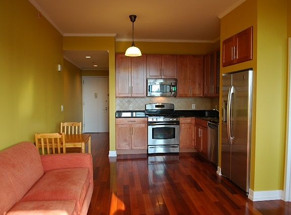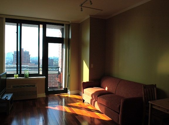 One bed including parking space in luxurious full service building in JC Downtown in A Condos.Nicely kept unit with terrace.Rent includes heat,hot water,gas,use of gymnasium and one deeded parking space. Close to path station for easy commute to city.One parking included.