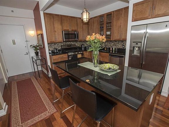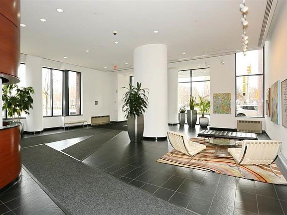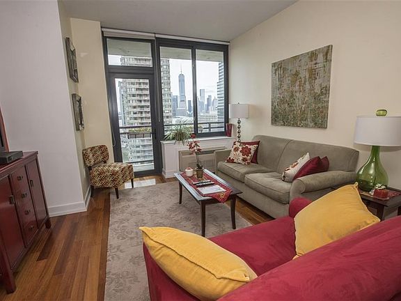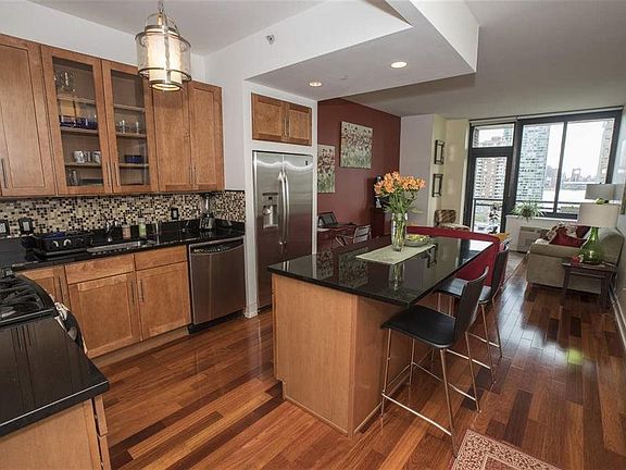Beautiful 1 bedroom at the luxurious A Condos with spectacular NYC and river views -- with garage parking included! Perfectly located in the heart of Downtown Jersey City's Powerhouse Arts District. This East facing Waterfront unit boasts a modern open layout, Brazilian hardwood floors, private terrace, gourmet kitchen with stainless steel appliances, and granite counter tops. Building features 24 hour concierge, gym, large common patio, and community room. Short distance to PATH (Exchange Pl., Newport, and Grove St) restaurants, shopping, parks, Newport Mall and Hudson River Waterfront Boardwalk.