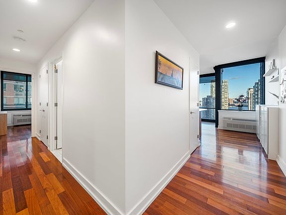 Indulge in sweeping panoramic views of NYC's iconic skyline from the floor-to-ceiling windows in this expansive 2-bed, 2-bath, 1366-sq ft condo. Light-filled living spaces complemented by 9 ft ceilings and oak hardwood floors reflect modern style and elegance at every angle. Prepare meals in the gourmet kitchen with warm maple shaker-style cabinets, sophisticated granite countertops, and sleek stainless steel appliances featuring a Bosch dishwasher. Delight in cozy sunrises and dazzling sunsets on the intimate balcony overlooking the Hudson. Retreat to the spacious primary bedroom which comfortably accommodates a king-sized bed set and boasts a generous walk-in closet. Relax in the luxurious marble primary bathroom complete with a full-length soaking tub, stand-up shower, and double sink vanity. In-unit laundry and 1 deeded parking space provide exceptional convenience. Thoughtful energy efficiency and privacy elements put the finishing touches on this unit with 4 gas-powered PTAC units individually controlled by Nest Learning Thermostats, thermal insulated Low-e glass windows, and thickly insulated walls. Enjoy a host of elevated building amenities: 24-hour concierge, fitness center, lounge, outdoor deck with BBQ, and children’s playroom. Centrally located a 5 to 10-minute walk to all 3 JC PATH stations, Harborside Ferry Terminal, and steps from Light Rail. Close proximity to Whole Foods and Newport Mall. Foodie paradise surrounded by award-winning global eateries and quaint cafes. Experience Jersey City living at its finest.