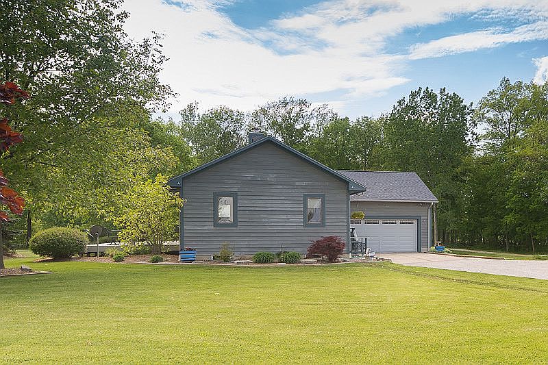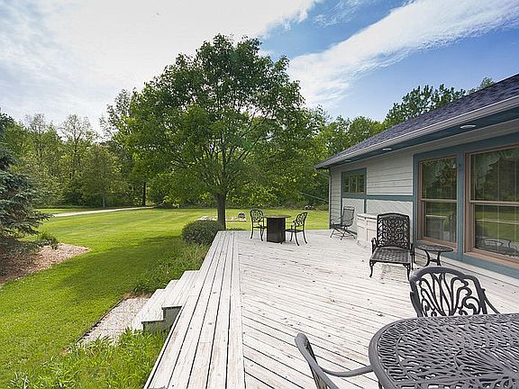 Pride of ownership shows in this 3/2 with oversized 2 car garage, split bedroom, open, light floorplan with vaulted ceilings, wall of windows facing 37 x 15.7 deck all situated on 1.1 acre. Full basement w/ rec room, wood burning stove, flex room and much storage. All appliances stay - refrigerator, microwave, new dishwasher, washer, dryer, freezer. 20x20 storage shed, Delco water and located next door to Mill Creek Golf Course.