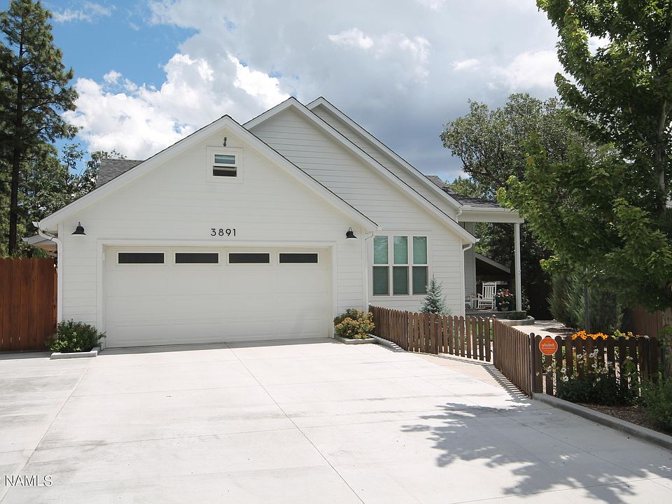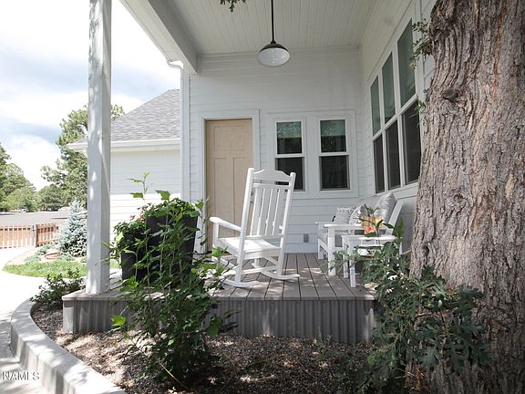 Ready to move into this lovely white house on a quiet cul-de-sac in desirable Swiss Manor? This upscale, single level home checks off everything a homeowner desires. Move in ready> Custom remodel with upgraded flooring, cabinets, countertops, appliances, lighting, windows, window coverings, doors, fixtures, and more> Primary bedroom with ensuite bathroom and two walk-in closets> Large office space> Mature irrigated evergreen and perennial landscaping> Porches and decks> Custom two room shed and covered outside storage> Huge attic storage and possible upstairs living space> New roof, insulation, Hardie Board plank cement siding and interior/exterior paint> Completely fenced with new perimeter sidewalks and driveway> Views of Mt. Elden and close to trails, shopping, and hospital.