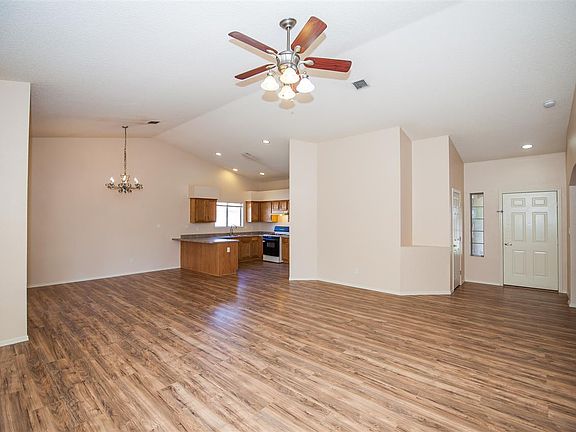 Pristine 4 bed, 2 bath home in Falls Ranch! ALL the flooring was replaced in the summer of 2019 - Carpet and wood laminate. Gas appliances, ceiling fans, and the master has a slider to the patio and a walk in closet. Light and bright and welcoming with high ceilings and an open floor plan. Inviting exterior as well with plenty of grass and mature trees! Location is perfect within walking distance to Crane schools, including Cibola high!