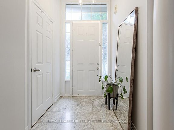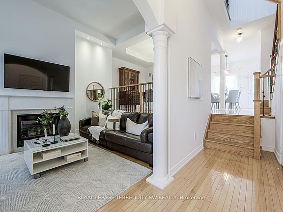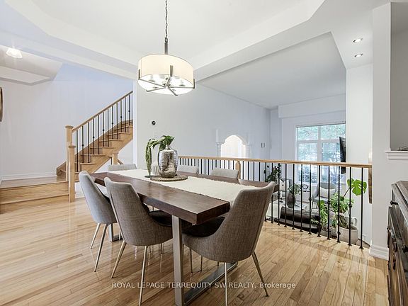 Welcome to this beautifully maintained 3 bedroom executive townhome in the heart of Churchill Meadows, one of Mississauga's most desirable communities. Featuring elegant hardwood floors throughout, new soundproof windows that fill the home with natural light, soaring 12" ceilings and a spacious layout designed for both comfort and style. The finished basement provides extra space for a growing family, the eat in kitchen make weekday meals a breeze and the interlocking brick patio in the make the backyard a comfortable retreat. Enjoy the convenience of a two-car garage and seamless access to major highways, renowned Credit Valley Hospital, dental offices, clinics, public transit and nearby shopping, making commuting and errands a breeze. Located in a top-rated school district, this home is perfect for families seeking both lifestyle and opportunity. With a prime location, and thoughtful design, this property offers the perfect blend of luxury and practicality