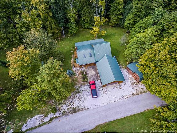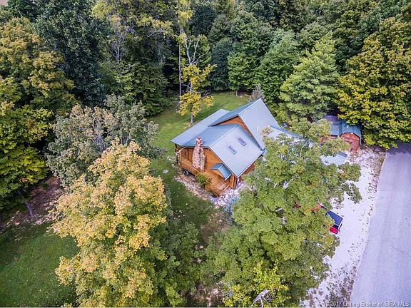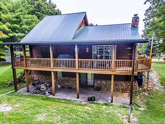 Enjoy country living, privacy, and a park-like setting while just minutes to shopping, Corydon, Interstate, and Louisville. This unique story and a half "Canadian Cedar" log home features: 2 Bedrooms, 2 Baths, Knotty Pine interior, Sky Lights, Decorative Stone Fireplace with Working Flue, Living room that opens to Loft and Kitchen, Eat-in Kitchen/dining area with abundance of cabinets, and includes all kitchen appliances. Washer and Dryer to stay. Wrap-around deck, full walkout basement, Newer Metal Roof, 2+ Car Attached Garage, Pole Barn, and Utility/Implement Shed and sits on 6.3 mostly wooded acres. *Acreage includes 3 separate lots: Tract #1 with home - has 2.48 acres, Tract #2 has 1.716 wooded acres, and add'l lot has 2.118 wooded acres - total of 6.3 acres.