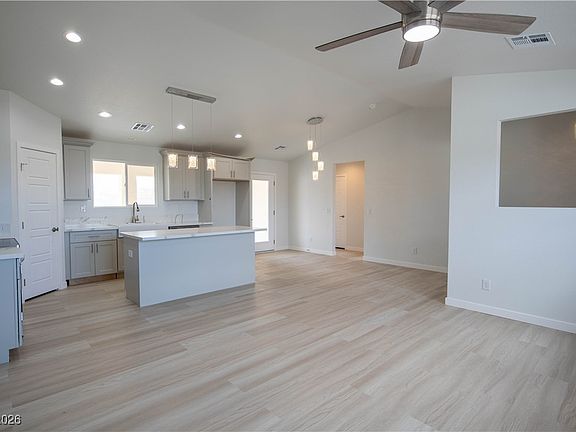 Welcome to this stunning new 3-bedroom, 2-bathroom home offering 1,502 sq. ft. of thoughtfully designed living space. Nestled amidst breathtaking mountain views, this home seamlessly blends modern elegance with practical functionality. The open-concept kitchen serves as the heart of the home, featuring sleek quartz countertops, perfect for cooking and entertaining. The primary suite provides a private retreat, complete with a luxurious en suite bathroom that includes dual sinks and an oversized walk-in shower adorned with porcelain tile. Two additional bedrooms are conveniently located off a central hallway, accompanied by a full bathroom with a shower and tub combination, making it ideal for family or guests. The low-maintenance front yard is beautifully landscaped with desert-inspired details, adding to the home’s charm and curb appeal. Don’t miss your chance to own this modern gem, where style, comfort, and nature come together in perfect harmony!