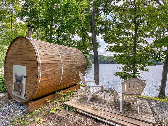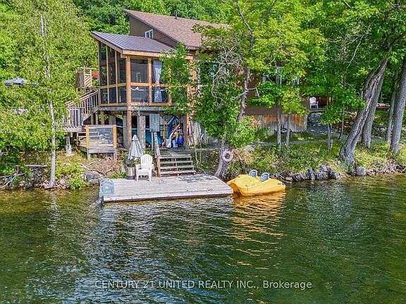 Imagine living on an island, with a driveway! This enchanting waterfront property boasts roughly 490 feet of breathtaking water frontage. Surrounded by serene waters, this cottage is a perfect escape, offering tranquility and natural beauty at every turn. Devil Lake is a deep, spring fed with great fishing and Frontenac Provincial Park is located on the lake. The west side of the property features a mesmerizing waterfall, providing a soothing backdrop to your everyday life. The cottage itself is a cozy, three-bedroom, one-bathroom haven, ideal for those seeking a peaceful retreat. The interior exudes rustic charm, with warm wood finishes and high efficiency wood stove. A highlight of the home is the screened-in porch, offering panoramic views of the water, a perfect spot for morning coffee or evening relaxation. For boating enthusiasts, the property includes a concrete dock, eliminating the hassle of seasonal dock removal and ensuring easy access to the water year-round. Additional property features are a wood fire sauna and its own private boat launch, making it incredibly convenient for boating and fishing adventures. This low-maintenance property is designed for easy living, allowing you to spend more time enjoying the natural surroundings and less time on upkeep. Whether you're looking for a weekend getaway or a full-time residence, this waterfront gem offers a unique blend of comfort, convenience, and stunning natural beauty. Don't miss the opportunity to own this idyllic retreat where every day feels like a vacation. Currently a successfully established Air B&B.