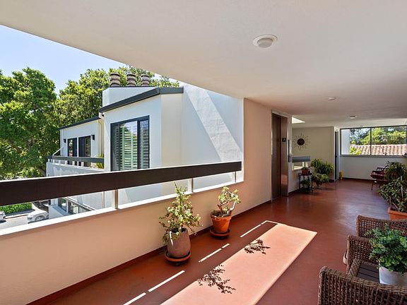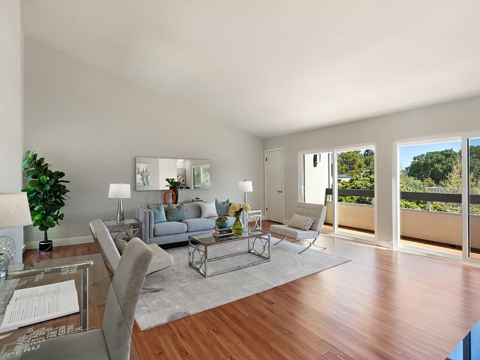 Desirable condo in Hayward Park. Top floor unit with no shared walls. Secure entrance and elevator access. Bright home with high vaulted ceilings, skylight, new dual pane windows and beautiful wood laminate flooring throughout. Spacious living room with fireplace and double sliding glass doors to the balcony. Kitchen features granite counters, stainless appliances, ample cabinets. Tile backsplash with decorative accents and under cabinet lights. Breakfast area surrounded by bright windows. Separate dining room off the kitchen with new light fixture and ample room to spread out. Sliding glass door to balcony. Two spacious bedrooms, each with large mirrored closets and en-suite bathrooms. Bathrooms are completely remodeled with sleek modern cabinets and glass shower enclosures. Convenient in-unit washer/dryer in the hall closet. Two secure underground parking spots with built in storage cabinets. The complex features nice grounds, and a swimming pool. This home is a short distance to Central Park and downtown San Mateo and all its amenities; shopping, restaurants, movie theater and public transportation. Calling this unit Desirable is an understatement.