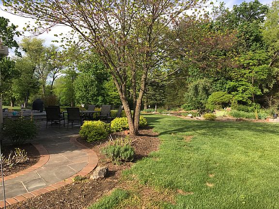 Beautiful colonial home situated on a premium landscaped lot surrounded by mature trees for privacy. Paver walkway leads to wrap around rocking chair front porch. Foyer entry opens to formal living room currently used as banquet size dining room with hardwood floors & crown molding. Eat-in kitchen with cherry stained cabinets, solid surface counter, tiled backsplash & updated appliances. Breakfast room has slider leading to tiered stone patio overlooking a private yard with lily pond and wooded backdrop. Family room features a double sided fireplace, slider to patio, direct entry to laundry room and attached garage. MBR features a walk-in closet, a new lavish bath with tiled shower and frameless door. 3 additional BRs, main bath and office complete the 2nd floor. Convenient location close to schools, etc.