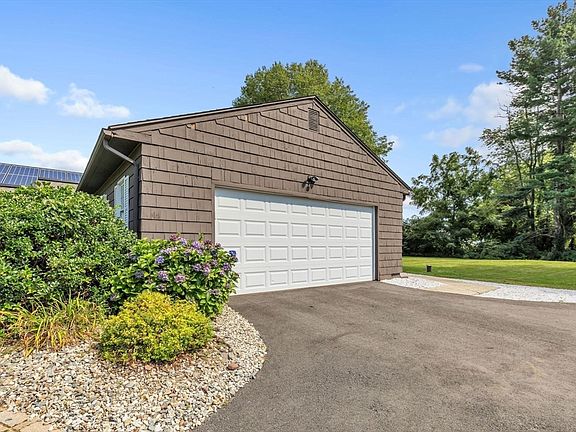 Stunning Ranch with Exceptional Features! This charming 3-bedroom, 2-full bathroom ranch offers impressive curb appeal and a meticulously maintained yard with a solar light lined driveway. Inside, the bright, sun-filled open floor plan showcases beautiful hardwood floors throughout. Both full bathrooms have been elegantly updated, with the en suite bath featuring a luxurious tiled shower. The open-concept living and dining areas are light and airy, with a slider leading to a spacious deck that overlooks the expansive lawn. Perfect for gatherings, the large family room boasts a striking floor-to-ceiling cobblestone fireplace. Ample storage is available in the full basement, pull-down attic, and oversized two-car garage, with additional space provided by a Kloter Farms shed. Energy efficiency is ensured with solar panels leased through Tesla and the home is also generator ready! For further details on updates and solar, see attachments. Don't miss this one, schedule your tour today!