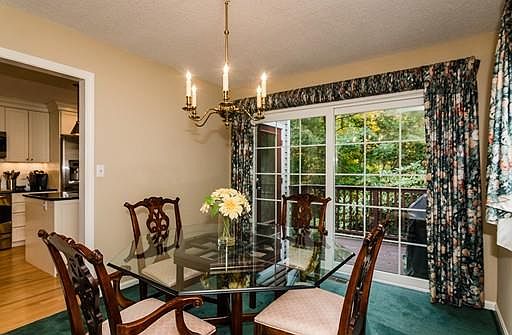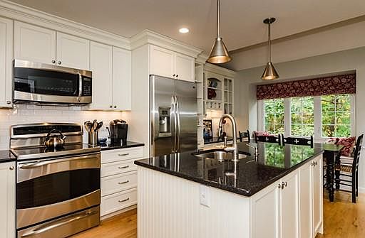 Bishops Forest ~ Salisbury Style. Lovely end unit with 3 levels of living. Soaring ceilings offer a dramatic design and opened spaces. Dining room has sliders to deck with private wooded views. The kitchen was renovated in 2013 and is magnificent. Every detail has been beautifully executed with hardwood flooring, crisp white cabinetry, granite counters, white subway tiled backsplash, brushed nickel hardware and GE Profile appliances. There is a window seat and wall of cabinets with a bead board feature. First floor master has spectacular cathedral ceiling, a loft, triple windows with wooded views, two closets and a full bath renovated in 2013. Two bedrooms on second floor with full bath. Walk-out lower level is finished with a family room, full bath with steam shower and 2 storage rooms.