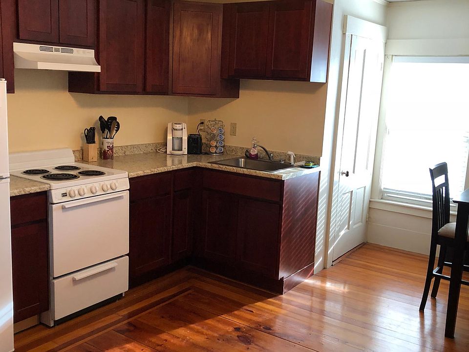 Large 2 open room studio located on the second with a three season porch with windows, a new kitchen with solid wood cabinets, hardwood flooring/carpet/tile, quiet street, with only garage parking for one car, there is no additional overnight parking. Located on the second floor of a three family home. Gas heat,cable, one garage parking space