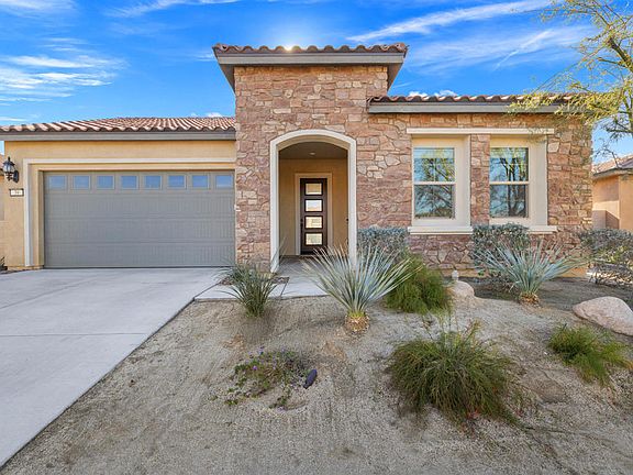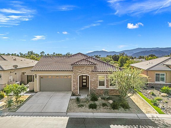 Welcome to Del Webb Rancho Mirage -- a premier 55+ community where resort-style living meets timeless desert elegance.This beautifully maintained 3-bedroom, 2-bath home showcases one of the community's most sought-after floor plans. All bedrooms are generously sized, with the third offering flexible use as a guest room, office, or den.Inside, sophisticated upgrades abound -- custom window treatments, designer ceiling fans, and elegant tile flooring create a refined ambiance throughout. The open-concept great room centers around a chef's kitchen featuring upgraded Whirlpool appliances (including dual ovens), soft-close cabinetry, quartz countertops with full backsplash, pendant-lit island seating, and a walk-in pantry.Dual upgraded sliding doors lead to an extended covered patio and expanded hardscape, ideal for entertaining or quiet evenings enjoying mountain views, the palm trees of the adjoining Westin Resort during the day, and twinkling lights at night.The primary suite is a private retreat, offering a spacious layout, dual quartz-topped vanities, premium cabinetry, upgraded lighting, a large walk-in shower with quartz surround, and a generous walk-in closet. Guest bedrooms and the flex space are thoughtfully separated for optimal privacy.Additional highlights include leased solar (approx. $113/month), an expanded laundry room with utility sink and cabinetry, and an oversized 2-car garage with extra space for a golf cart or additional storage. Residents of Del Webb Rancho Mirage enjoy a vibrant, active lifestyle with access to world-class amenities -- a state-of-the-art clubhouse, resort pool and spa, fitness center, pickleball, tennis, bocce ball, and more.Experience the perfect blend of luxury, comfort, and community living -- all within one of the desert's most desirable 55+ destinations.