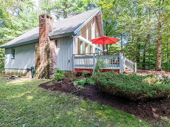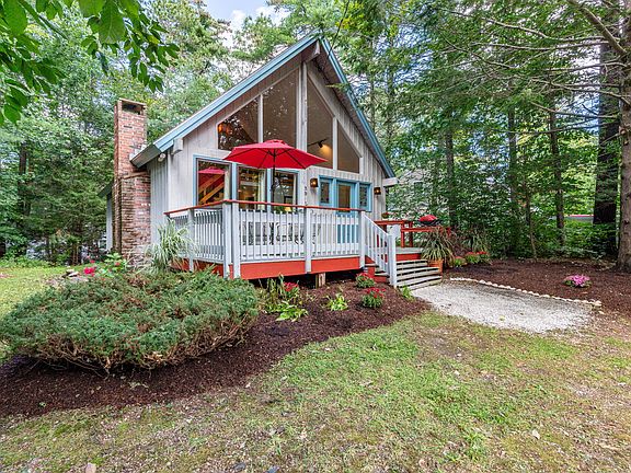OPEN HOUSE Saturday September 23 - 10am-12pm. Showings to begin at Open House. This storybook A-frame getaway is quaintly tucked away among assorted pine trees on a generous .46-acre parcel that, from the very first glance, you know you have arrived in Maine! A large entertainment deck welcomes you to an attractive front entryway flanked by custom-made stained glass windows. Step inside to an open layout that has been cleverly updated to capitalize on available space. Fresh interior paint throughout, along with updated kitchen and bath enhance a relaxed and informal interior. Floor-to-ceiling windows drench a lodge-like design with natural light while cathedral ceilings provide an open and airy atmosphere. Wide pine floors and wood accents can be found throughout a 2-bedroom plan while a private balcony off the 2nd story bedroom offers a romantic treehouse experience. This coveted address offers expansion potential and investment / rental possibilities and is located just minutes to shops & restaurants of Ogunquit Village, world-class beaches, Marginal Way and all attractions north and south.