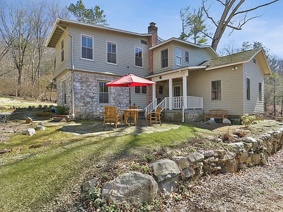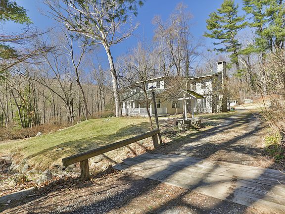 This 1844, updated and well-maintained antique, known as "Sabine Farm" is situated on 6 acres. The property includes a charming farmhouse, a three-story multi-purpose stone barn with a main floor studio/office/guest room and upper level loft in addition to an enchanting art studio (converted turkey coop) with skylights. Enjoy the lovely abundant acreage with babbling brook from your front porch or a view into the woods from the back porch or patio. You will appreciate the magnificent landscape of numerous perennials and mature trees. Main home features hardwood flooring throughout, 9 ft ceilings, beams, 2 fireplaces (1 with wood burning insert) and a granite mantle, French casement windows, spacious kitchen with breakfast nook/mud room and butler pantry, open shelving and glass cabinet doors, a main floor bedroom, full bath, sunny dining room with French doors and a family room. On the second floor of the home is the master bedroom with walk-in closet, full bath, a 3rd bedroom, separate laundry room and an office/studio with 2 storage closets that could easily be converted into a 4th bedroom with walk-ins. Outside is a nature's paradise with stone walls, fruit trees, elevated terraces to sit and enjoy the sunsets, climbing trees, blueberry bushes and fern gardens. Driveway's wooden bridge over stream is reinforced with five I-beams underneath. This extremely hard to find multi-functional property is priced to sell and must be seen to be fully appreciated.
