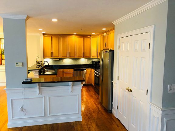 Privacy, space and convenience is what this meticulous 4 level townhouse nested on over an acre of property has to offer! Prime location! Walk to Whole Foods, fine restaurants & shops!! Close to Rt 90 & Rt 95, public transportation.This beautifully maintained end unit has an open concept first floor with fireplace, modern eat-in kitchen with sliders leading right to the private patio. The second level has a large master suite with his and her custom closets & a master bath with an updated large walk-in double-door tiled shower There are also 2 more large bedrooms & another full bathroom on the second floor. The 3rd floor is open, spacious, and bright. It is currently being used as a home office/exercise/music room & boasts 3 1/2 closets for storage & another FULL bathroom. The finished basement adds additional living space of almost 900SF and is currently being used as a play/recreation area. Bonus 2 car garage!