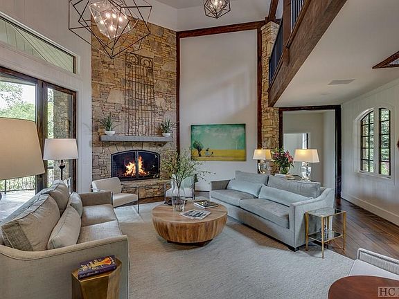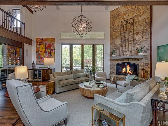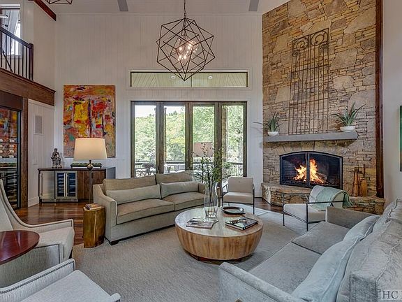 Interior designer Darren Whatley has transformed and reimagined this wonderful lakefront home to reflect the tastes and needs of families seeking a sophisticated mountain retreat. This custom lakefront home is in the heart of Cullasaja Club and sits astride two lots, for a total of 1.6 acres, on beautiful Lake Ravenel. There are six bedrooms, six and one-half bathrooms, expansive entertainment space and over 2,000 sf of covered outdoor space. The lot has extensive nature trails, a lakeside gazebo, and a boat dock. The main living area has a beautiful glass enclosed wine room, a large native stone stacked fireplace and folding Nano doors that look out to Lake Ravenel to create an open flow to the beautiful, covered back porch, which has a beautiful stone fireplace. From the living room one moves to the kitchen and adjoining sitting area, then on to the dining room, all of which enjoy expansive views of the lake. The kitchen includes Wolf and Subzero appliances, two dishwashers, quartzite countertops, custom, and locally crafted cabinetry. Adjoining the kitchen are a walk-in pantry and a tiled laundry room. The primary suite is also located on the main level. A luxurious spa bathroom, with a large, quartz topped bathtub and a shower with multiple shower-heads. The bedroom features a vaulted ceiling, a custom bed, and glass doors opening to the porch, providing beautiful lake views. The upper level has three guest suites, all with outdoor spaces, two with full lake views, and an additional laundry area. There are built-in reading nooks and bookcases on this level, as well. One of the bedrooms has been furnished as an executive home office space. The terrace level has two additional guest suites, expansive storage space, and a large media room, with an adjoining wet bar area. This newly renovated home has an attached two car garage with a golf cart space. This home affords the amenities and spaciousness for a large family or for entertaining guests. Fireplace Features: 2 or more