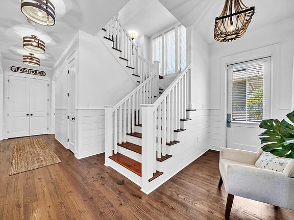 Nestled within the picturesque Cypress Dunes subdivision, on the South side of the West end of 30A, this delightful home presents 2446 square feet of living space, fully furnished with designer furniture and accessories. The residence boasts 4 bedrooms and 3 1/2 bathrooms, with one bathroom being a Jack and Jill. Upon entry, a welcoming foyer awaits, ideal for dropping off your beach hat after a day at the beach. In the entry hall is an oversized closet to store all of your beach toys. The first-floor hosts three bedrooms, two of them having French doors leading to a cozy Southern style porch nestled among the mature trees. The tucked away laundry room is on the first floor. This home has an extra long driveway to park a golf cart and 2 cars. There is a grilling area complete with seating.