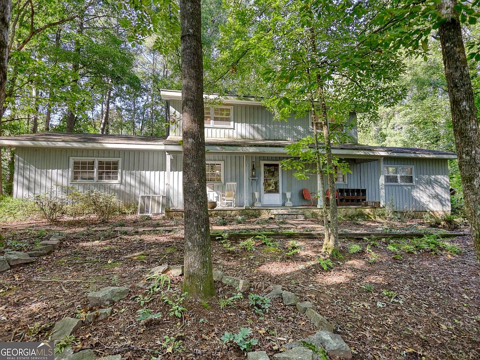Come enjoy your cup of coffee on the covered front porch as the cool, crisp, fall mornings are just around the corner. This rustic country home is tucked away on 1.8 acres and even has private lake access! Vaulted ceilings in the living room and absolutely gorgeous masonry fireplace. Spacious sunroom overlooks the lake and garden area. Owner's suite on main level with wheelchair accessible doors and shower. 2 bedrooms upstairs with jack and jill bath. Pool House does have running water and fully functional bathroom. This property has so much to offer! Come check it out before it's gone. Sold As-Is. This is an estate sale. Professional photos coming soon.
