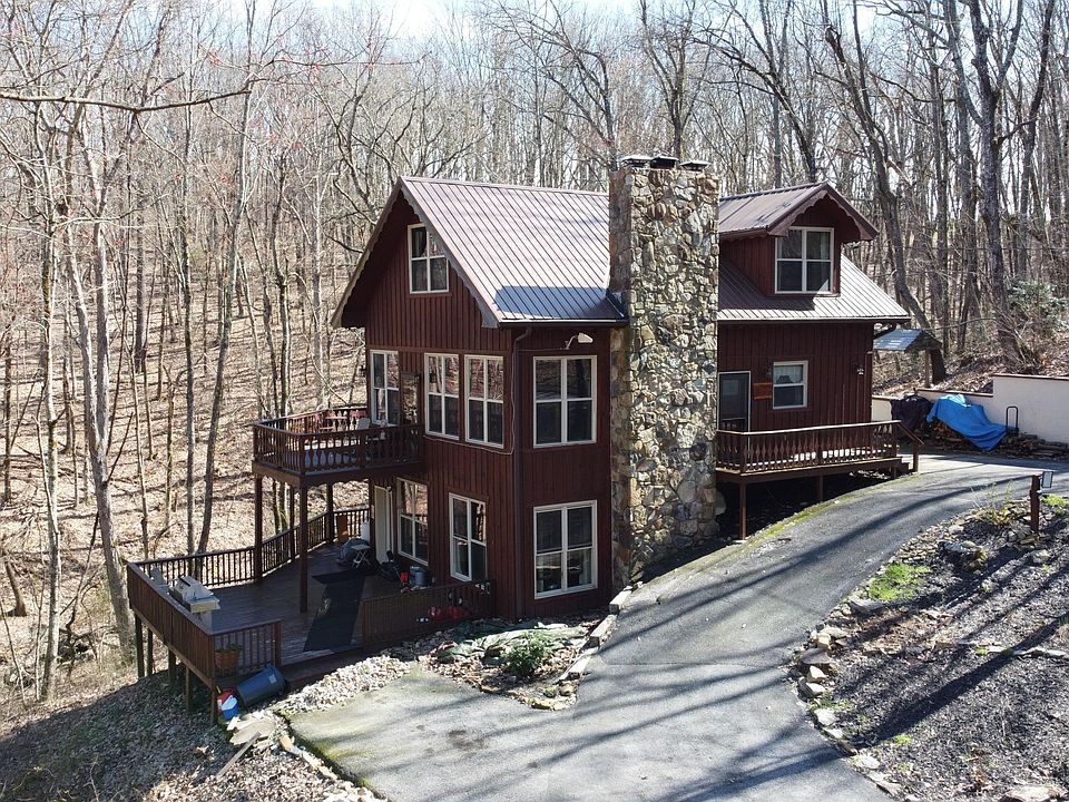 Not your average house, complete remodel in 2017w/custom updates throughout; including a new roof, pex plumbing throughout, & high efficacy gas filled windows! Paved circle drive to private wooded lot w/creek in back. Only house in small canyon & the last house on the road. Whole House Generac & decks on two levels for outdoor entertaining. 3 full baths & 3 full bedrooms. Exposed beams on main level w/ floor to ceiling stone fireplace in living room, large oak mantel, & oak hardwood floors. Upstairs balcony overlooks main level. The entire bottom level is apx 864sqft & your master suite. Barnwood tile, pocket doors, & large tiled barrier free shower, copper sink wet bar. Seller is giving $1,000 credit for road maintenance & $2,000 for deck painting/staining with acceptable offer.