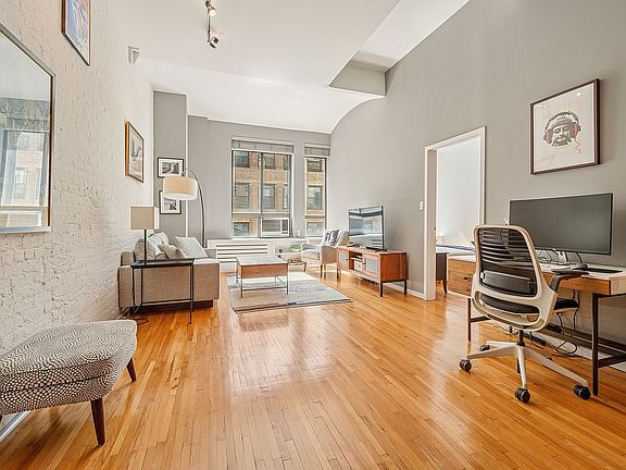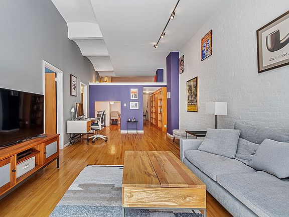 Welcome to a sunny south-facing one-bedroom with soaring 11-foot ceilings, exposed brick, and a loft. The spacious living room is lined with oversized windows, filling the home with natural light and offering ample room for both seating and dining.