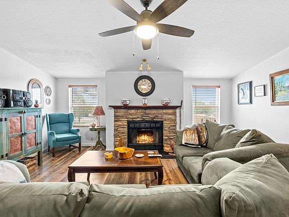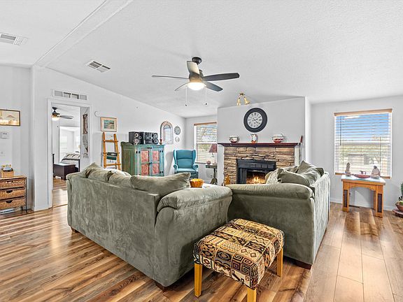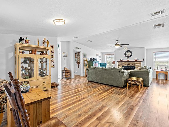 This spacious and updated country home shines with updated flooring, new cabinets throughout the large kitchen and dinning area, and vinyl windows. The gorgeous wood burning fireplace invites you to entertain and unwind on nearly 1 1/2 acre lot. Hay storage with connected electric and second brand new storage shed. Rear yard access. Located near local police station, shopping, restaurants and grocery stores, just minutes from I-40.
