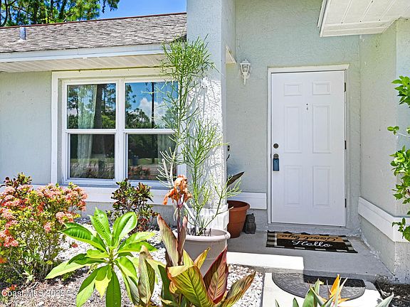 Located directly on Emerson Rd and set back, convenient proximity to St Johns Heritage Pkwy. Minutes by car to Malabar Rd, 192 or Palm Bay Rd. This home has City water, Two spacious living areas in this home as well as a dining area - nice floor plan gives this home a larger feel than square footage. This concrete block home is equipped Hurricane impact windows installed in 2018, roof has 15 years remaining (see docs tab for 4 point). New Hot water heater in 2021. Open split floor plan, Stainless Steel Appliances in kitchen. Washer dryer included in sale. Screened patio in rear with a beautiful poinciana tree. Fenced yard. No HOA