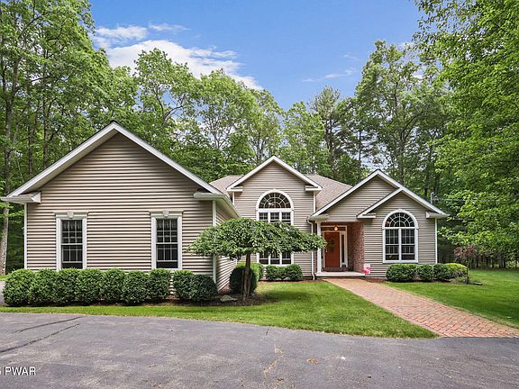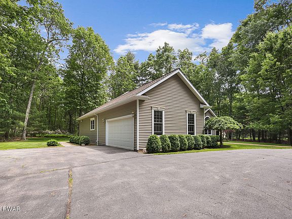 Welcome to a rare opportunity to own a truly luxurious custom-built single level home, designed and constructed with expert craftsmanship and meticulous attention to detail on a manicured 1.3 acre pristine parcel. This immaculate 3-bedroom, 2-bath home offers single-level living at its finest, featuring soaring 18-foot vaulted ceilings, gleaming hardwood floors throughout, and elegant architectural touches in every room. Step through the stately brick entry into a sunlit open floor plan with formal living and dining areas, anchored by a beautiful double-sided propane fireplace that also warms the inviting sunroom. The chef's kitchen boasts granite countertops, custom cabinetry, a full appliance suite, and a charming breakfast nook that opens to an expansive maintenance-free deck overlooking the lush, professionally landscaped private backyard. The primary suite is a private retreat, complete with a spa-like bathroom with soaking tub, walk-in tiled shower, and a generous walk-in closet. Two additional bedrooms, a stylish full bath, a large laundry/mudroom, and ample storage complete the interior. Additional features include an attached oversized 2-car garage, detached 1-car garage, full unfinished basement, whole-house generator, central A/C, and a wraparound blacktop driveway. Tucked away in a private, serene setting just minutes to Honesdale and Lake Wallenpaupack, this exceptional home is truly one of a kind! Come see it to appreciate it's beauty!