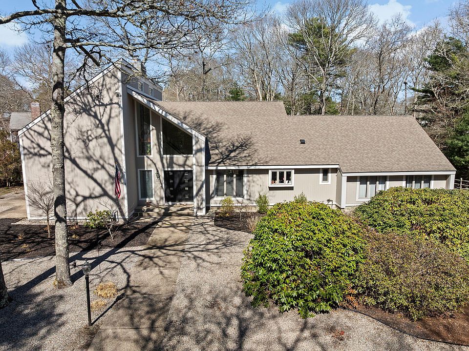Bright & airy Contemporary four-bedroom, 2.5 bath home located in the sought-after, private Waterside community on Coonamessett Pond. This move-in ready residence features a spacious living room w/soaring ceilings, stone fireplace & exterior access. The primary en-suite w/walk-in closet & home office both offer access to the exterior. The state-of-the art chef's eat-in kitchen fully renovated in 2014 boasts a large island & gas stove, complemented by an adjacent dining room & family room with direct access to a three-season porch. Additional highlights include first floor laundry, half-bath & direct entry to the two-car garage. Upstairs, you will find a loft area with fireplace, three bedrooms, family bath, bonus room, mechanical room & extra storage areas. The unfinished lower level offers abundant storage. Recent Updates: 2014 Roof, 2018 Mass Save, 2021 new Bulkhead , 2024 new Sliding Doors & Garage Doors & Openers, 2025 New Septic System & fireplaces cleaned. This is a winner!