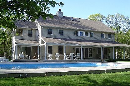 In a quiet area of the Hamptons this home features 4 bedrooms, and 3.5 baths. The large deck is great for outdoor eating. 3 acres of lush landscaping are surrounding the heated pool.