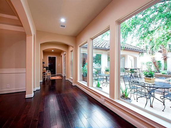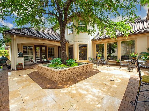 WALLS OF WINDOWS in most downstairs rooms overlooking the large, private courtyard which is like another room * and what a courtyard: covered porch, summer kitchen, and LOTS of room for entertaining; plus low maintenance travertine and brick pavers, and raised flowerbeds * open floorplan with extensive wood flooring * 48\" Wolf gas range * built-in fridge * plantation shutters * two bedrooms down * 3 car garage * walk-in closets * rear porch off breakfast room * tile roof * and storage galore: there\'s a huge closet off the laundry room, another large closet near the laundry room, and a huge walk-in pantry * secret door from downstairs bedroom to 3rd garage bay * two bedrooms up with Jack & Jill bath, and also an extra room currently used as media room * and there\'s attic storage, too! A truly neat and LIVE-ABLE floorplan!
